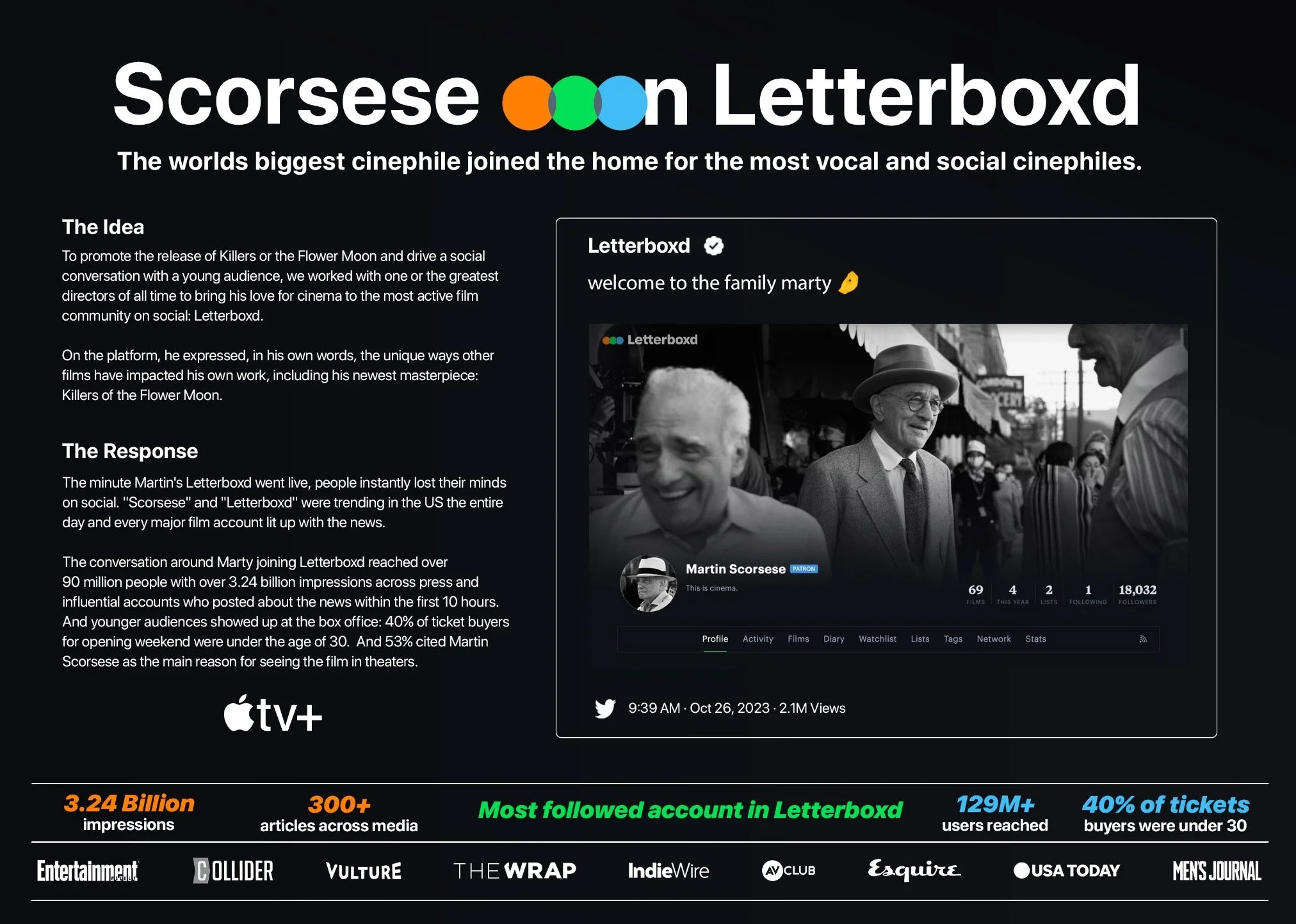 At Dentsu Creative, I worked on the Digital/Social account for Apple TV+, focusing on crafting content across the Apple TV and Apple Films social channels to promote titles such as Killers of the Flower Moon, Ted Lasso, Hannah Waddingham’s Christmas Special, Lessons in Chemistry, The Buccaneers, Dickinson and Slow Horses.
